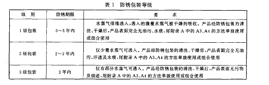 ①包裝的防銹等級(jí)應(yīng)根據(jù)產(chǎn)品的抗銹蝕能力、流通環(huán)境、包裝容器的結(jié)構(gòu)、包裝材料的一般性能等因素來(lái)確定,防銹包裝等級(jí)分為:1級(jí)包裝、2級(jí)包裝、3級(jí)包裝.詳見(jiàn)表1,